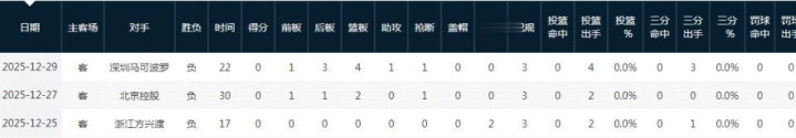 对阵深圳22分钟0分3篮板1助攻1抢断3犯规