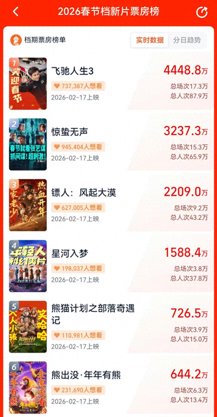 春节档马上就到,大年初一上映的六部电影同一时间开启预售并很快拉开差距。《飞驰人生3》断层领先,截至发稿,已经比预售垫底的《熊出没·年年有熊》多出近4000万。