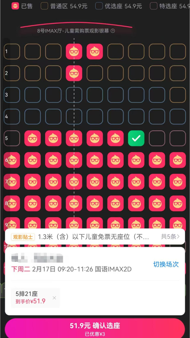 今年春节档几部影片都会投放一定金额的票补,以某热门大片为例,开启预售首日某影院IMAX厅不限区域票价39.9,元,第二天升至51.9元,依然是票补后的价格。